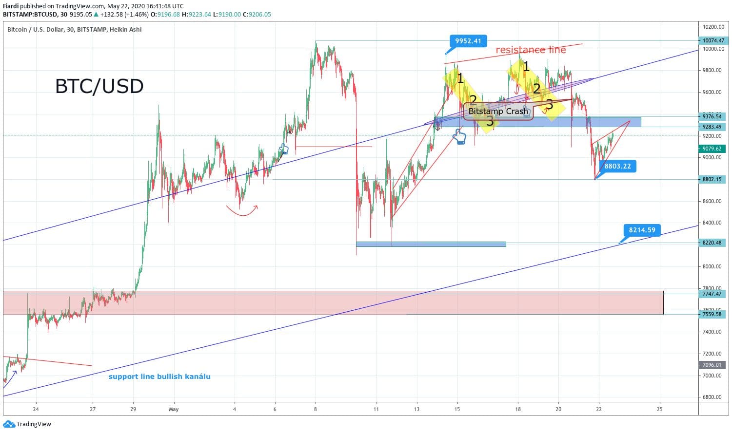 Od 20.05. je to celé zpomalené a přišel propad, čeká se na prolomení odporu na 9200-9376 USD. Bulls čekají na svou příležitost, ale odpor na 9 376 USD vzbuzuje velký respekt. Podpořit ho mohou světové trhy a jejich růst, ale i tam se to uklidnilo a vidíme 1 – 3% denní rozptyl, což určitě neovlivní Bitcoin.
