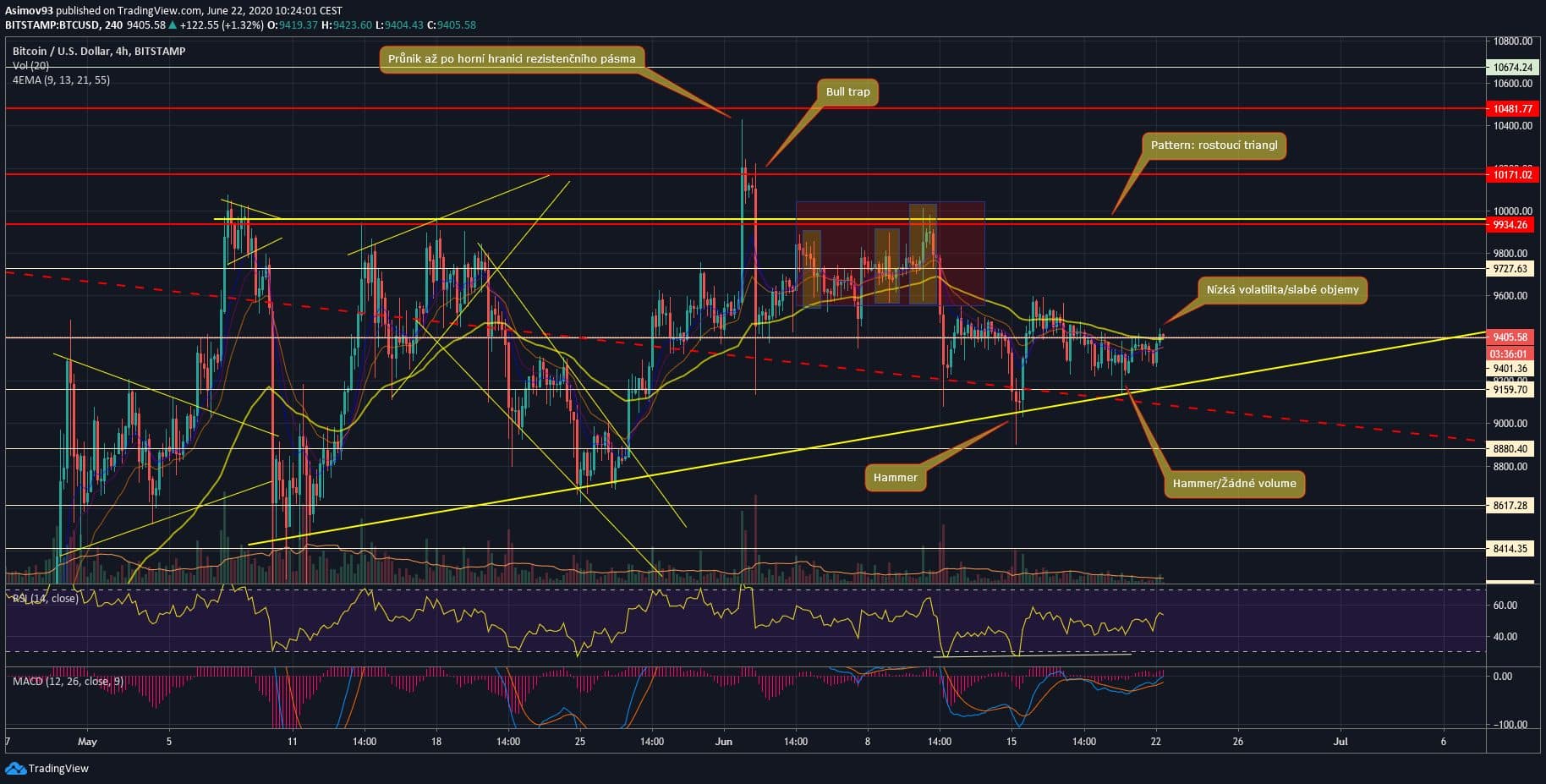 Ten soustavný pokles trval až po S/R level 9 159 USD, kde byla zároveň i spodní hrana zakresleného rostoucího trianglu. Povedlo se vytvořit další bullish svíci hammer, ale za tu svíci máme naprosto žalostné objemy. Což je taky důvod pro to, proč trh tentokrát nezareagoval takovým impulsem jako předtím z 15. června.