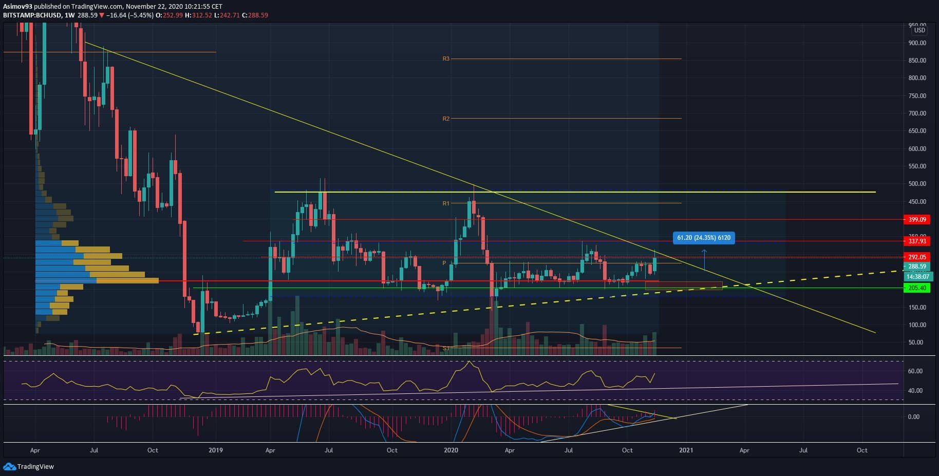 Rozebereme si trhy z makro pohledu, k čemuž je nejlepší týdenní časový rámec. Na nižších TF člověk akorát vidí dlouhé zelené svíce a to nám toho moc o celkové situaci nepoví. Začneme tedy s Bitcoin Cash, kde dle mého názoru byl ideální vstup kolem 200 USD. Je zde totiž konfulence, kterou nemálo zmiňuji. Relativně blízko je point of control na Volume profile.