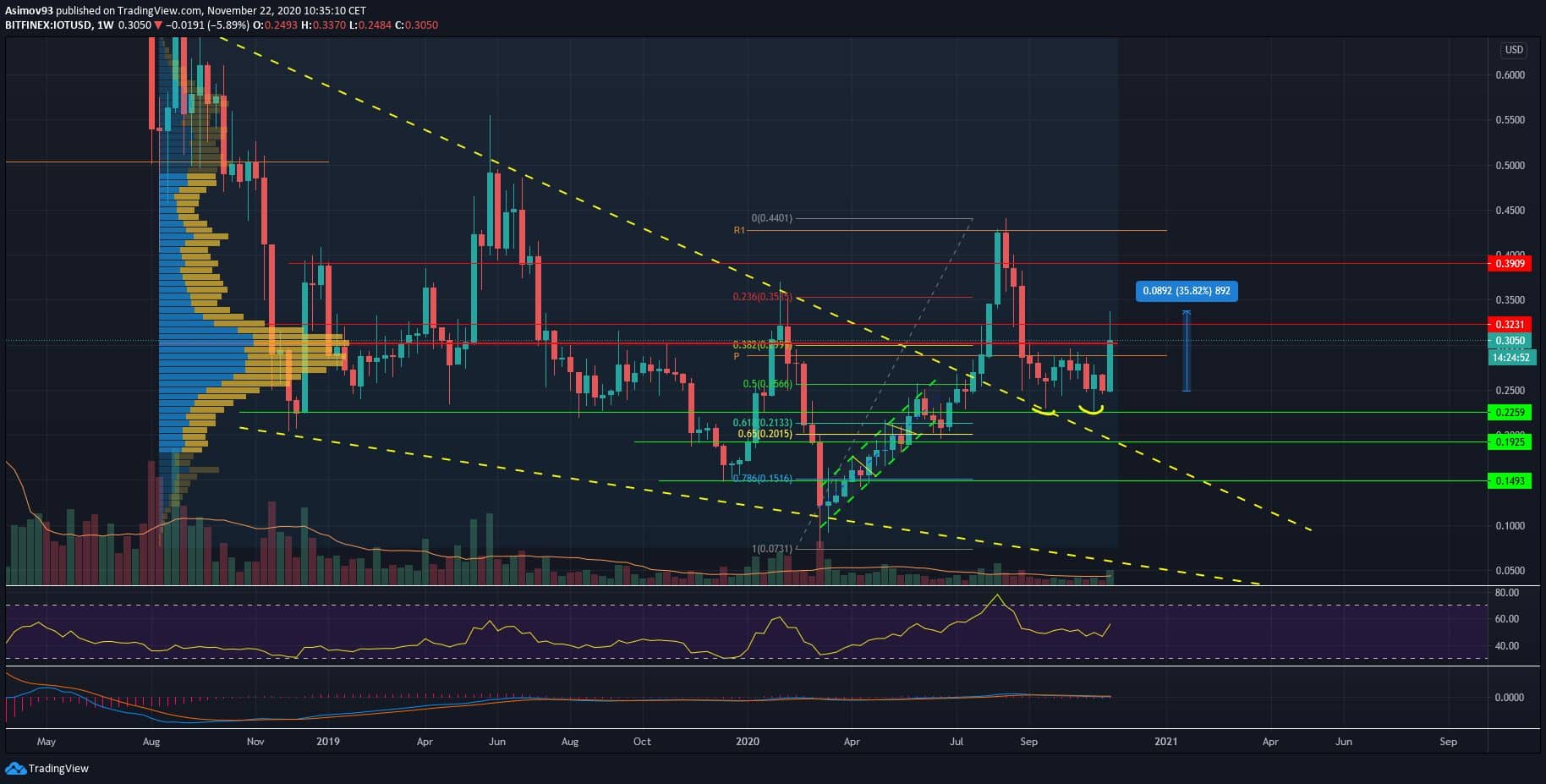 Graf s IOTou vypadá famózně, neboť se potvrdil ten starý průraz z falling wedge. Kolem 21. září totiž proběhl retest horní stěny patternu. Kurz posléze vyloženě nepumpoval směrem nahoru, ale i ten stranový pohyb lze brát kladně. Navíc se S/R Level 0,2259 USD potvrdil jako spolehlivý support, se kterým lze do budoucna počítat.
