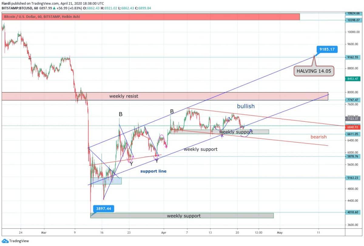 Bitcoin se včera zastavil na hodnotách 6 760 USD, od kterých se odrazil směrem k 6 950 USD a posílil. Sumář včerejšího dne měl dokonce mírně ve ztrátě, no tentokrát je to dobrým znamením pro investory, kteří chtějí vidět Bitcoin znovu nad 7 000 USD a jsme blízko. Podporu stále vidíme na 6 750 USD, což vyplývá z bullish kanálu. Momentální návrat do bullish kanálu jen utvrdí investory v long. Za tímto růstem můžeme hledat už i halving, který se nezadržitelně blíží. Jeho datum je naplánován na 14.05.2020. Halving je zde každé 4 roky a zkrátí odměny pro těžaře o polovinu. V tomto případě z 12,5 BTC za vytěžený blok na 6,25 BTC.