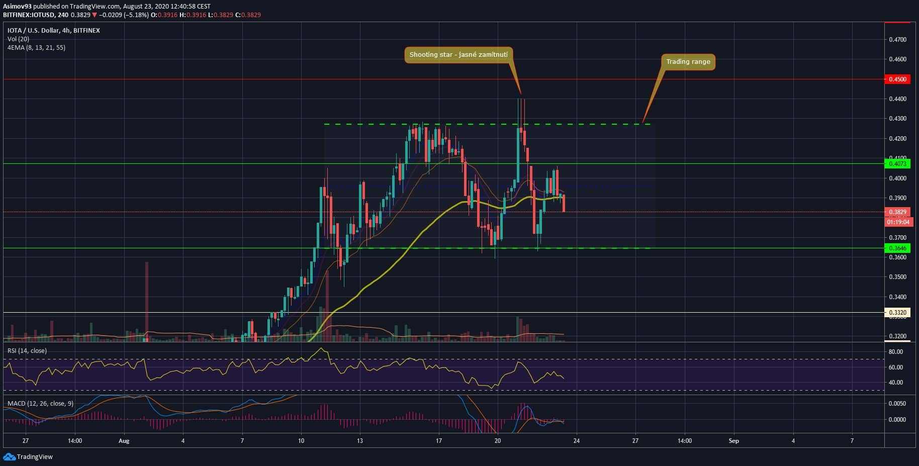 Jak jsem se včera zmiňoval v analýze na Bitcoin, tak spíše počítám s tím, že trh půjde krátkodobě dolů. I vlastně na IOTě vidíme díky price action, že býci jaksi nejsou schopni to efektivně pushnout nahoru. Nicméně, jestli půjdeme na tomto trhu dolů, tak nejdřív musí padnout úroveň 0,3646 USD. To se ovšem zatím daří spolehlivě bránit.