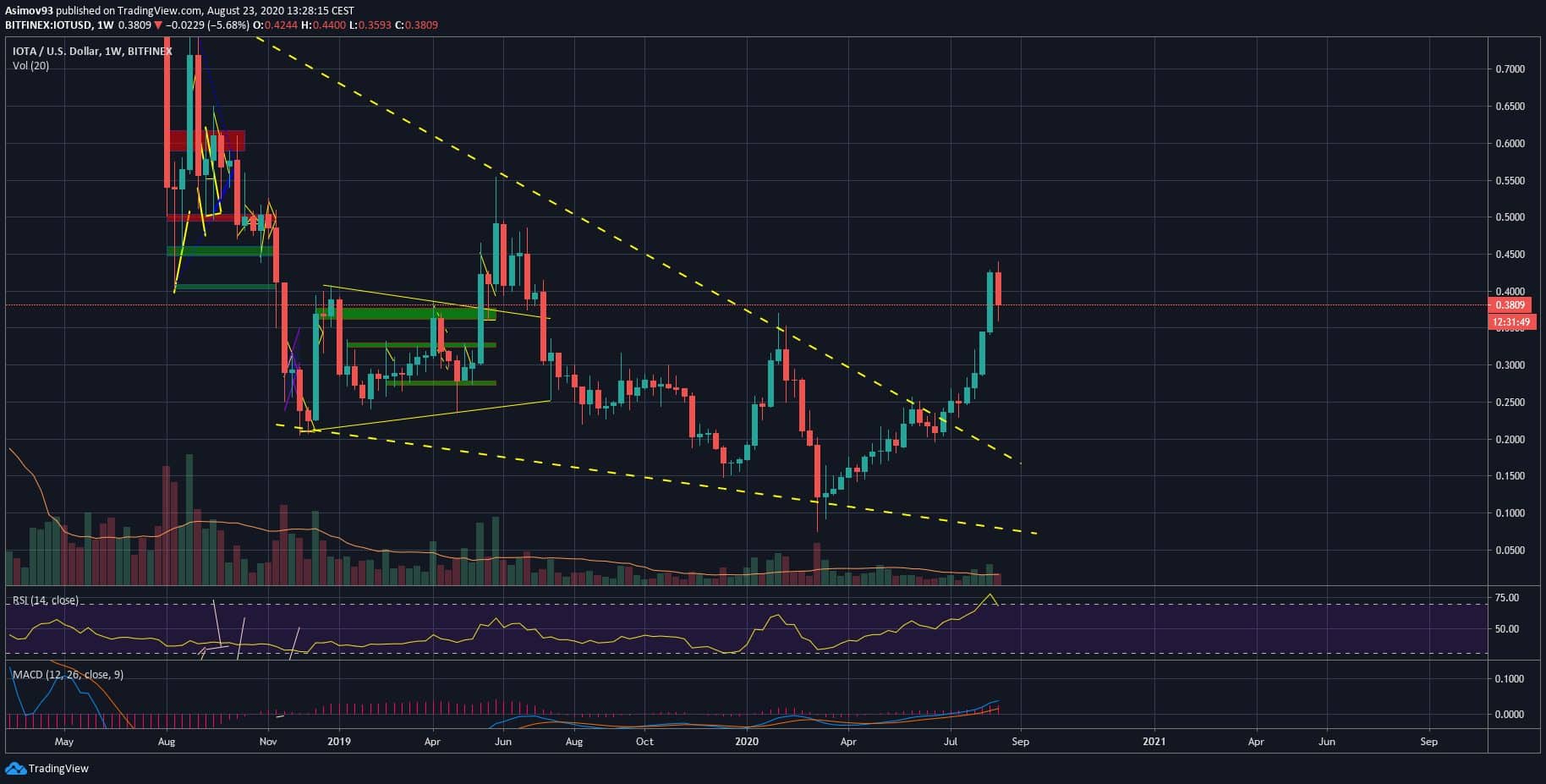 Před více jak týdnem jsme si udělali vcelku komplexní analýzu na trh s mincí IOTA (doporučuji se podívat). Tehdy jsme si ukázali, že je IOTA v býčím trendu, který by mohl v závěru být i dlouhodobého charakteru. Samotná struktura trhu zkrátka napovídá, že by aktuální expanze mohla vydržet i déle jak rok.