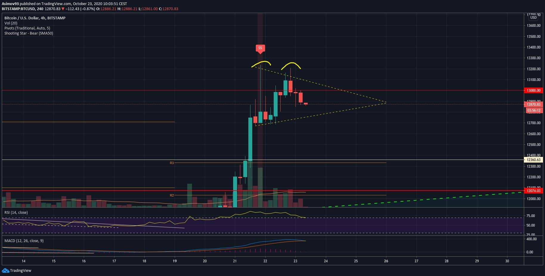 Podmínky pro to jsou, neboť Bitcoin zatím selhal při snaze překonat středeční high, což je zároveň knot extrémně bearish svíce shooting star. Ta situace na grafu je nyní velmi riziková a každou chvíli to může tvrdě crashnout. Jediná šance na růst spočívá v tom, že dojde k nějaké krátké konsolidaci do podoby třeba býčího praporku. V tom bych osobně viděl nějakou šanci na pokračování v expanzi.