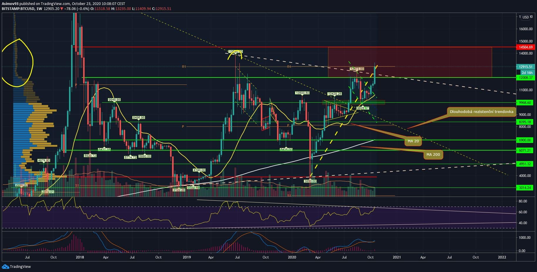 Akorát ještě doplním, že se postup kurzu zastavil na ročním pivotu R1 a nejsem ani v polovině cenového rezistenčního pásma 12 000 USD – 14 500 USD. U některých právě plyne tak nesmírné pozitivum z toho, že jsme překonali těch 12 000 USD. Ale když se zhlédneme ty dlouhé knoty u předešlých týdenních svící, tak si uvědomíte, že není úspěch ani atakování těch 13 000 USD.