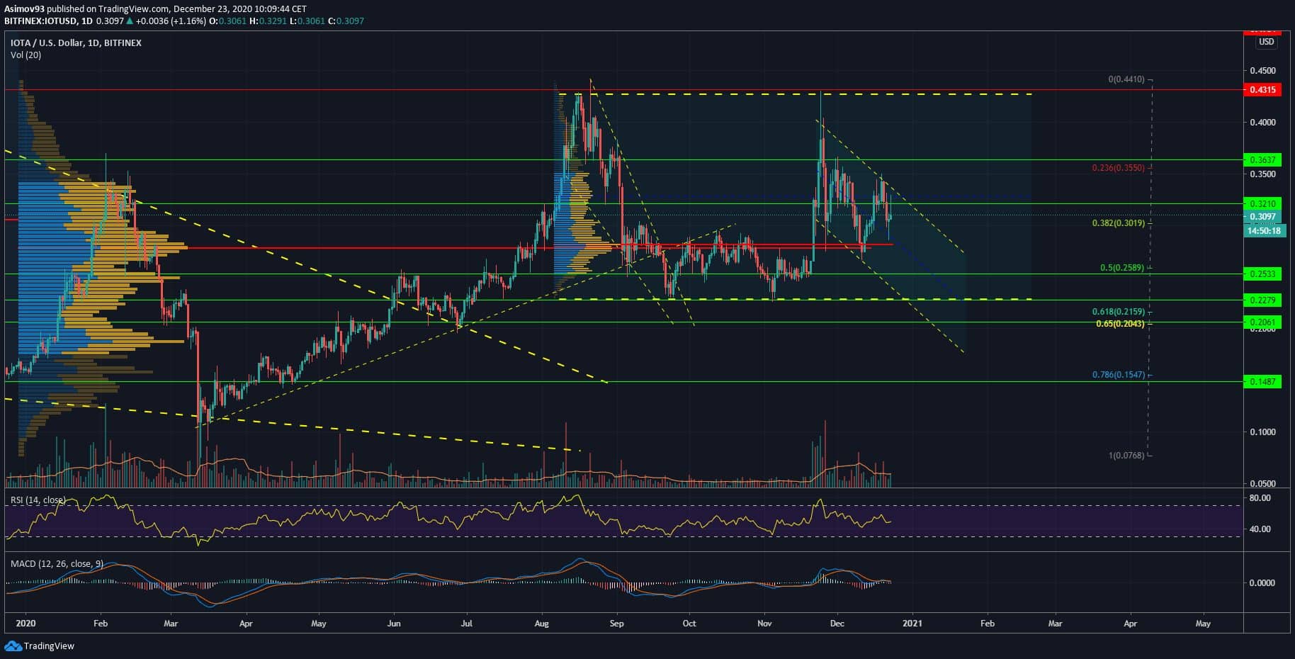 IOTA se nepřekvapivě drží mnohem lépe, ale zde nebylo zhodnocení mince až tak příliš agresivní. Technicky vzato trh už srpna stagnuje, protože jsme se bohužel nikam vůbec neposunuli. Což si lze snadno vizualizovat pomoci stranového obchodního pásma a hned díky tomu naše oči vidí, že půl roku se IOTA výrazně neposunula ani na jednu stranu.