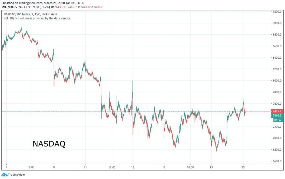 Od propadu vidíme mírný pohyb do strany jako na Bitcoinu, tak i na Nasdaq. Od low hodnot tu máme teď mírný růst k současným hodnotám. Důvodem jsou informace, že centrální banky zmírňují negativní ekonomický dopad na firmy a státy kvantitativním uvolňováním peněz.