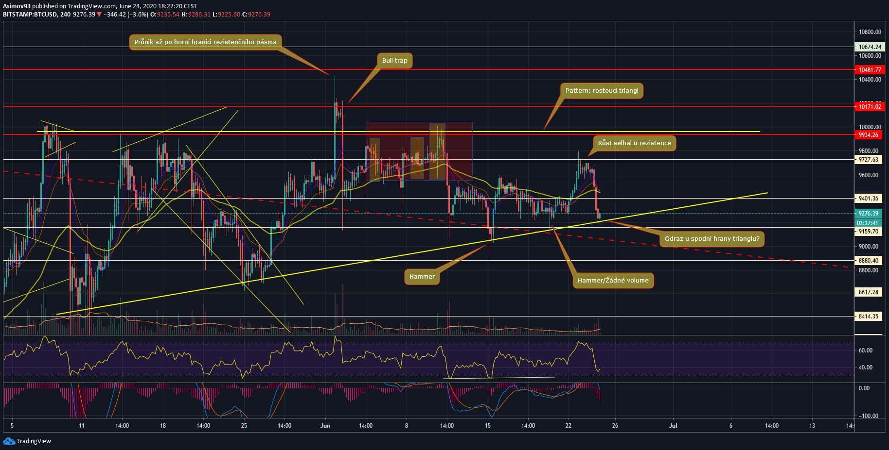 Ztratilo to úplně akceleraci a dnes se to rychle překlopilo. Výprodej to nebyl značný, ale bohužel S/R hladina 9 401 USD se jako support nepotvrdila. Cena vyklesala až po tu zmiňovanou spodní hranu zakresleného trianglu a teď holt nezbývá jenom čekat, co z toho vzejde. Vidíme i, že býci se pokusili bránit a pushli cenu zpátky po S/R level 9 401 USD, ale tentokrát se level zachoval zase jako rezistence.