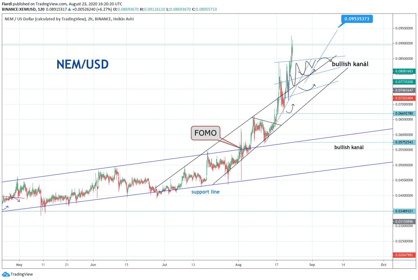 NEM (XEM) trhá bull run rekordy v roce 2020! Momentálně se pohybujeme na 0,089 USD, což je nový cenový rekord roku 2020. Předešlé high NEM zažil na 0,078 USD. XEM má za sebou odpor právě na 0,08 USD a momentálně se bude snažit prolomit 0,10 USD. Na grafu sledujeme prolomení trendového kanálu přes resistance line směrem nahoru, poté nastalo FOMO a to dovedlo NEM k 50% agresivnímu bullish kanálu. Momentálně vidí investoři prostor růstu k 0,10 USD. Podporu vidíme na 0,078 USD. Na grafu je vidět množství podpůrných linií, ale i linií odporu, které bude muset NEM překonat. Graf je velmi agresivní z pohledu růstu a zatím nevidíme výrazné oslabení růstu. Proto i my předpokladáme růst k 0,10 USD.