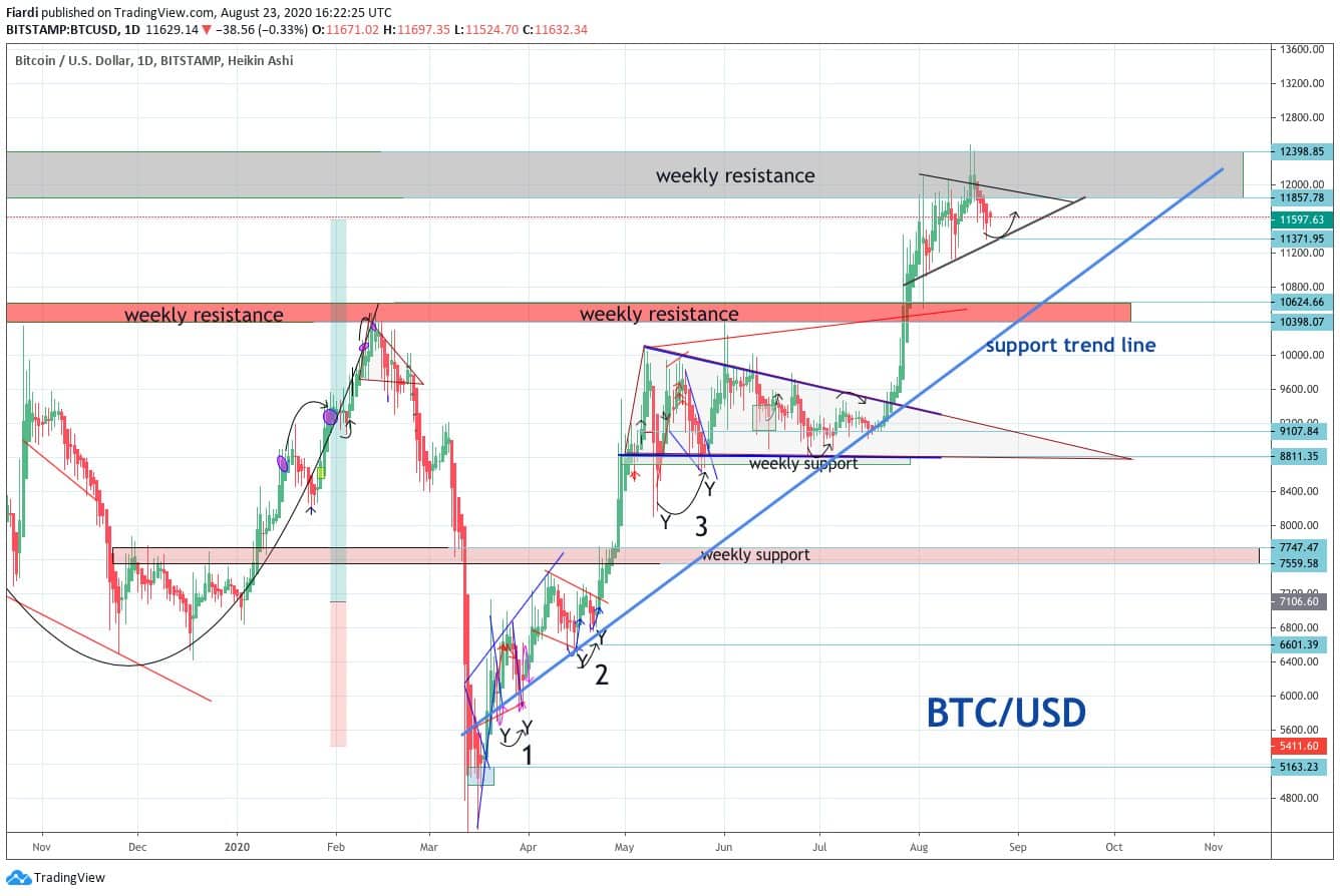 V neděli večer se Bitcoin pohyboval na 11 659 USD a nevidíme žádný větší pohyb. Bitcoin k večeru mírně vzrostl o 0,5 %. Víkend nám na BTC začal menším propadem k 11 400 USD. Bitcoin se samozřejmě drží v blízkosti 12 000 USD odporu. Podporu momentálně hledáme na 11 400 USD. Jak vidíme na grafu, stále držíme formaci trianglu, ve které se investoři pohybují po neúspěšné snaze prolomit 12 400 USD odpor (bull trap).