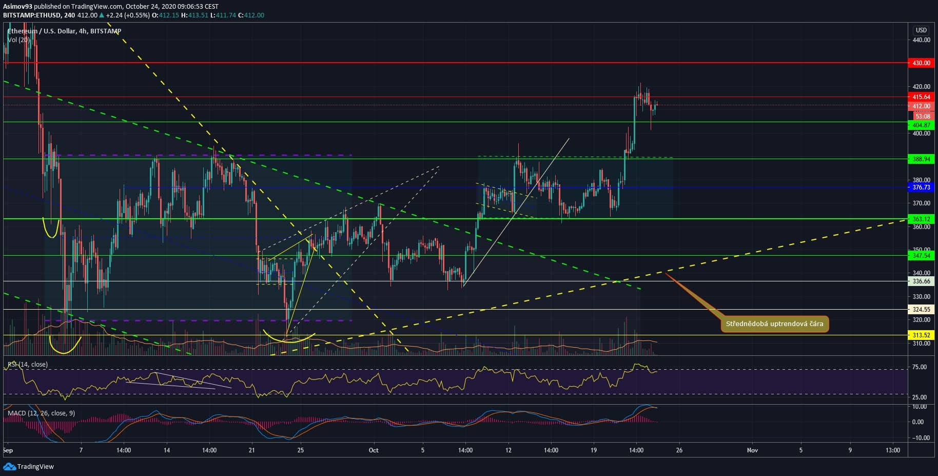 Kurz Etherea po nějakou omezenou dobu stranově konsolidoval v rámci toho obchodního pásma. Konkrétně jsme se tam nacházeli cca od 10. října až do 21. října, kdy proběhl průraz skrze horní hranu pásma, kde byl i S/R level 388,94 USD. Spodní stěna toho pásma byla samozřejmě tvořena další S/R úrovní, takže se nám level 363 USD potvrdil jako spolehlivý support.