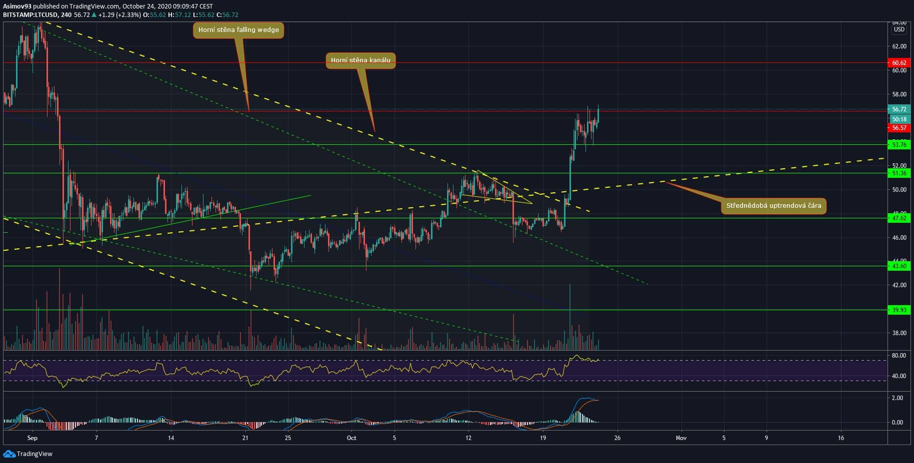 Jak jsem řekl v úvodu, tak Litecoin moc hezky zareagoval impulsem, čímž krátce zastínil ostatní altcoiny. Nakupující byli hlavně přesvědčivě úspěšní při průrazu skrze střednědobou uptrendovou čáru, čímž se LTC dostal zpátky do své expanzivní struktury. Přesvědčivě to bylo proto, neboť ta impulsní svíce byla jednak velká a také měla rekordní objemy.