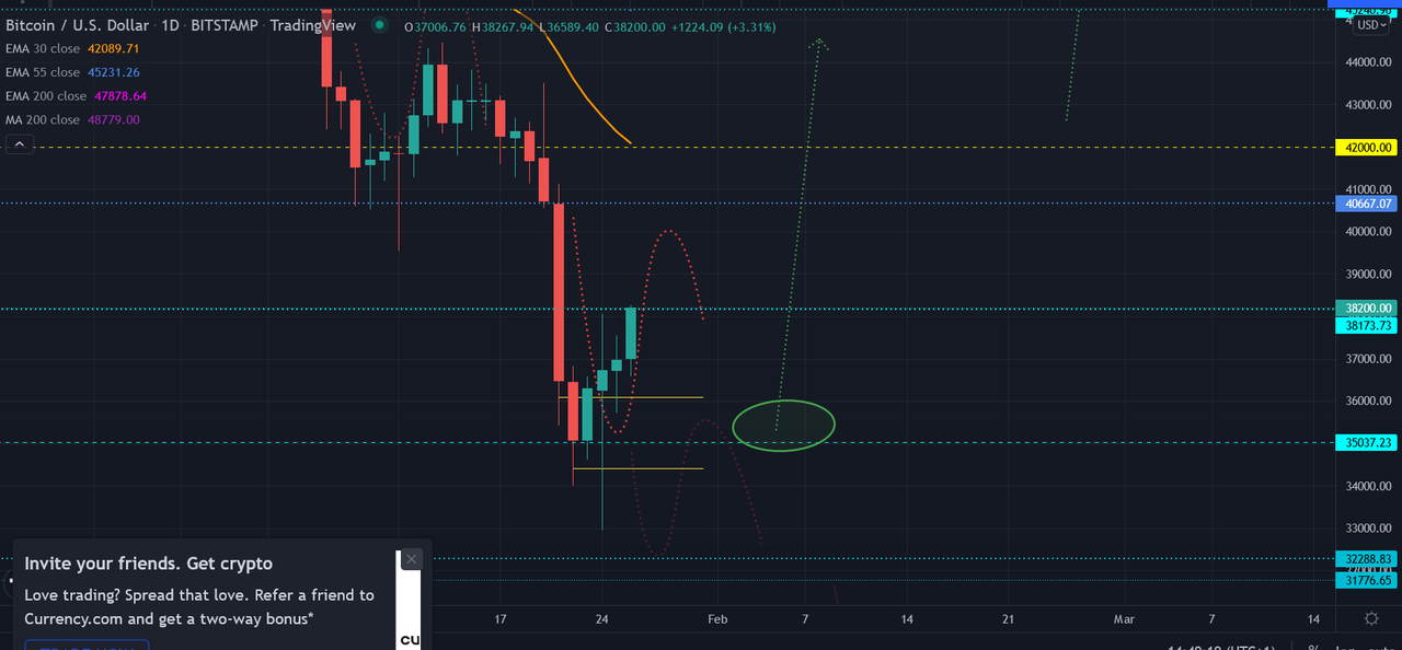 Nelze očekávat rovnou průraz UP a proto se počítá s dalším retestem hladiny 35k $. Jestli se má pak realizovat má úvodní predikce pro rok 2022, retest 35k $ by byl famózním odrazem. Ale to ještě nebudeme předbíhat. Na to je třeba si počkat, jak ten trh nakonec bude reagovat. Jak jsem zmínil ve videu, i když ta myšlenka je pěkná a technicky krásně do grafu sedí, stejně si ten trh udělá co bude chtít.