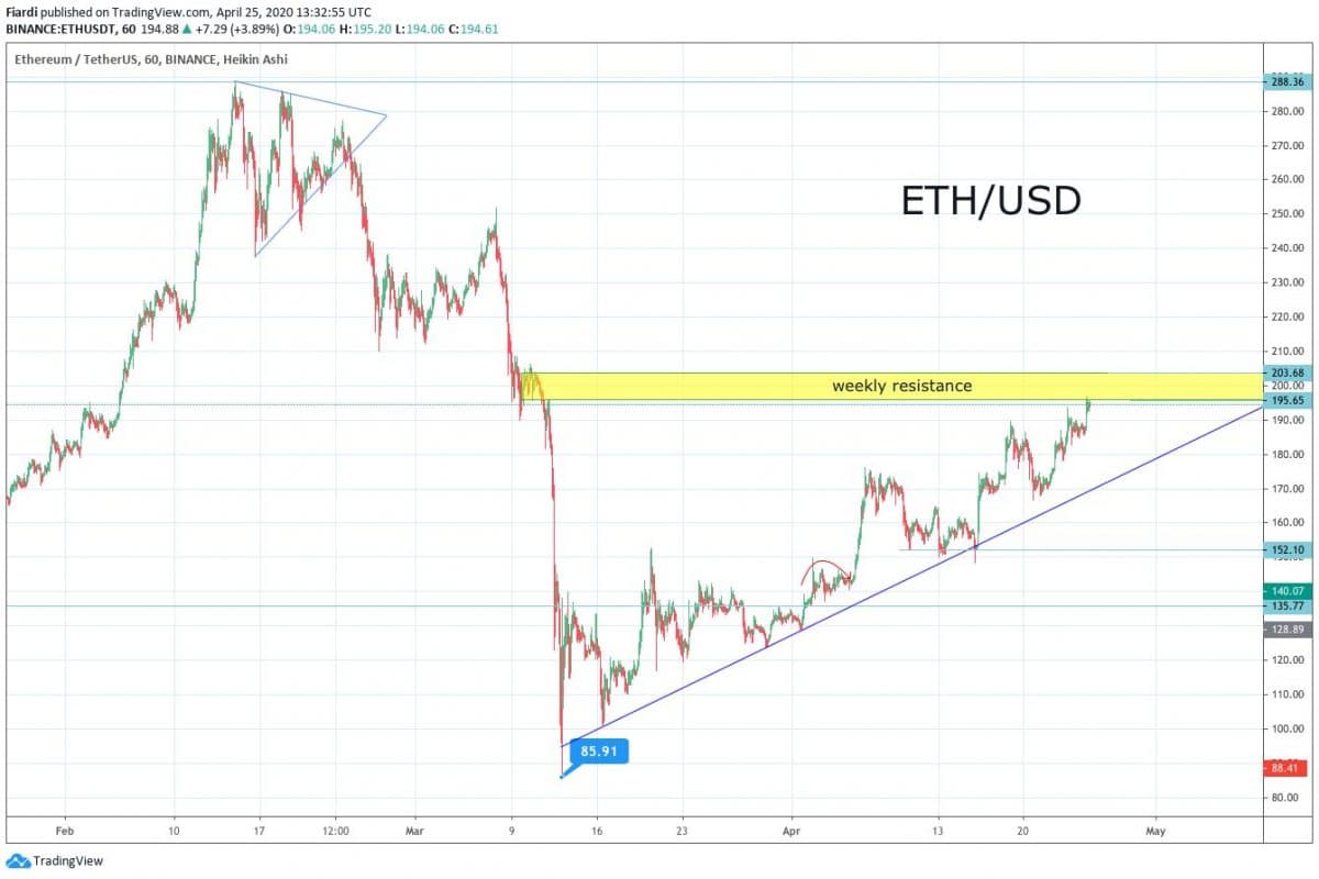 Ethereum stále patří ke coinům, které za rok 2020 jsou stále v plusu i po výrazném propadu trhu. Dnes vidíme hodnoty na ETH na 193 USD. Podle grafu, kde sledujeme hlavně vzestupný kanál, se musíme řídit vrchní a spodní stranou kanálu. Nejbližší podpůrně linie jsou na hodnotách 178 USD. Tato hodnota bude dobrým bodem k odražení se směrem nahoru. Nejbližší odpor sledujeme na hodnotách 195-203 USD.