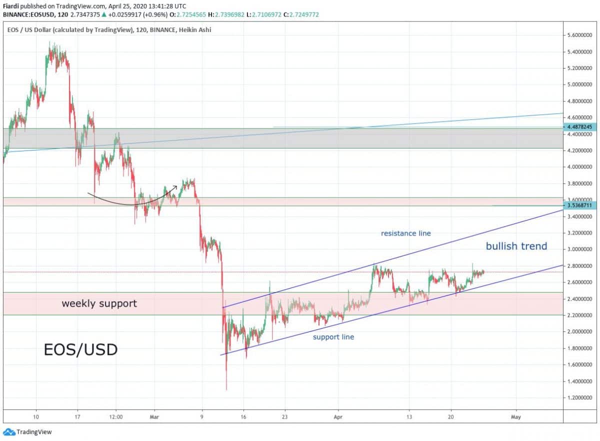 Momentálně se v době psaní článku pohybujeme na 2,75 USD a musíme konstatovat, že v sobotu se nic podstatného na EOS neděje. To podstatné přišlo v pracovní týden. Odlepili jsme se od 2,47 USD a bulls ani zdaleka nemusí skončit na 2,73 USD. Nejbližší odpor vidíme na 2,47 USD a následně 3,05 USD. Support máme na 2,47 USD. Máme tu i jinou support line, která vytváří bulish kanál, ta se posunula na 2,58 USD.
