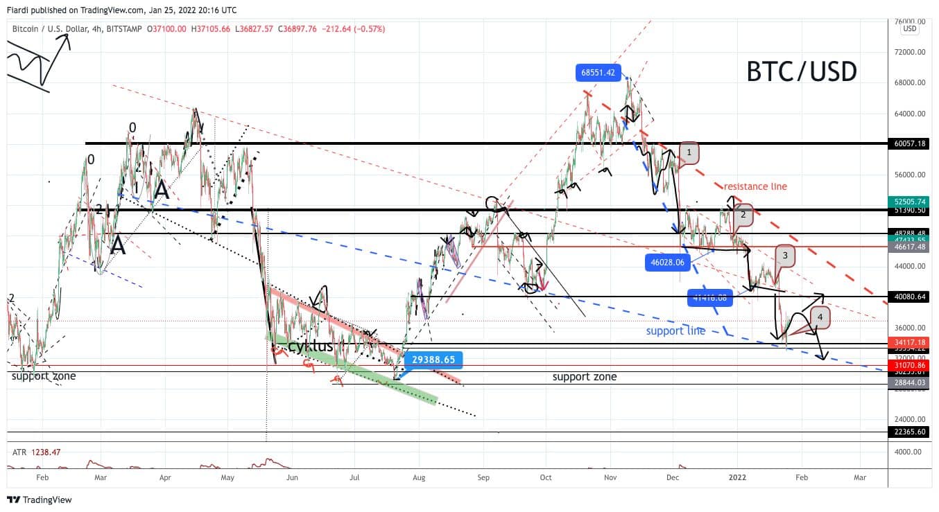 Bitcoin (BTC) během posledního víkendu propadl na 33 000 USD v rámci grafu sledujeme známý kaskádový bearish pattern. Které hodnoty investoři momentálně sledují?