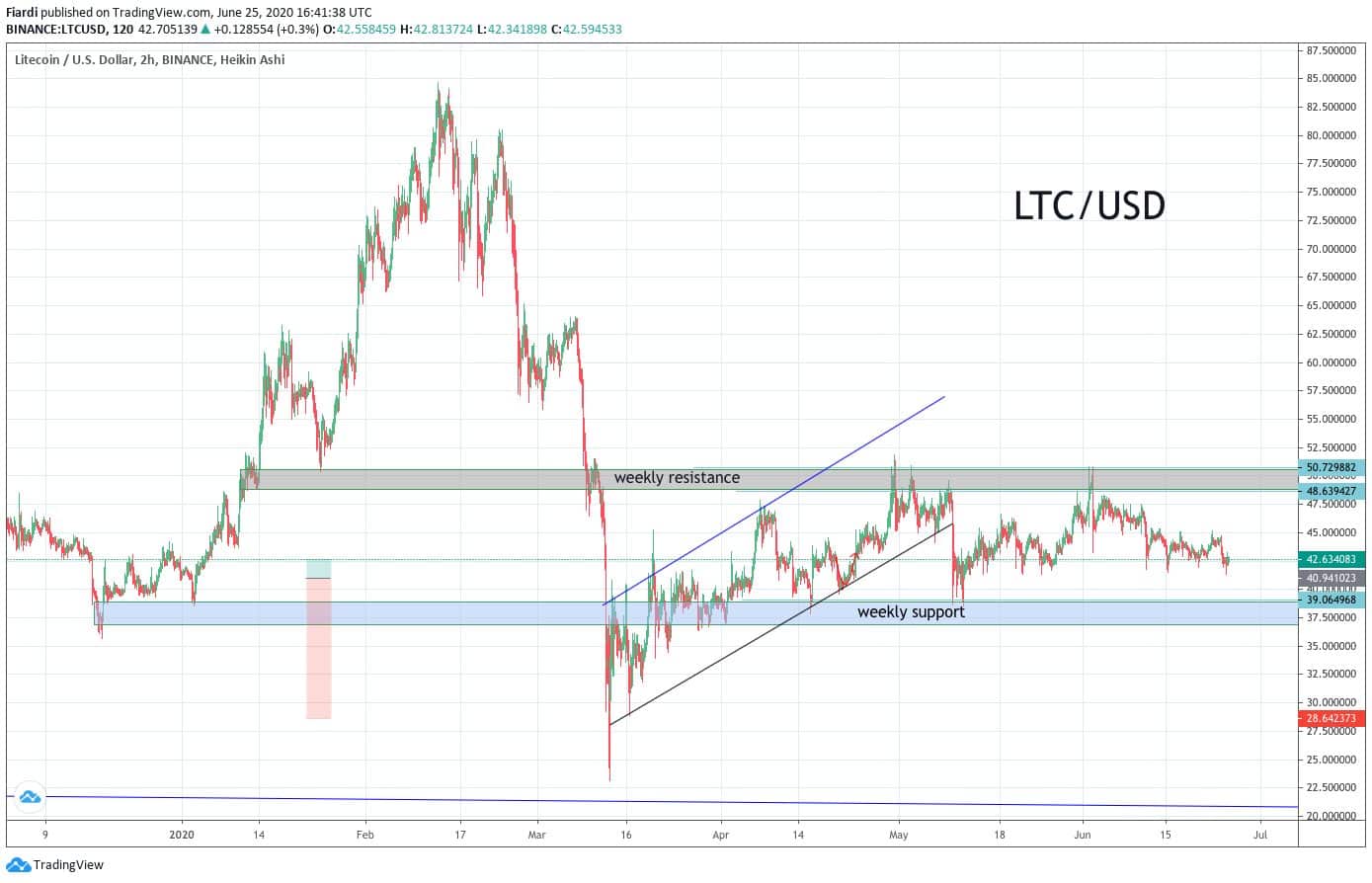Momentálně se pohybujeme na 42 USD za kus Litecoinu. Za rok 2020 jsme jen ve 4% plusu. Takové hodnoty, ať už v USD nebo zhodnocení za rok 2020, asi mnoho fanoušků nepotěší. Litecoin přitom začal rok 2020 vskutku dobře, když se dostal na high tohoto roku na 84,6 USD, což představovalo zhodnocení v tomto roce 105%. Potenciál tam stále je, ale jak vidíme i na grafu, investoři se více soustředili na Bitcoin a jeho halving než na Litecoin. Nezbývá než zhodnotit, že ani v létě nás nečeká výrazná pumpa a spíše pohyb v rámci kanálu. Investoři by to ale mohli roztočit až na podzim, a protože jsme v tomto roce viděli růst o 100%, je dost možné, že se to zopakuje znovu.