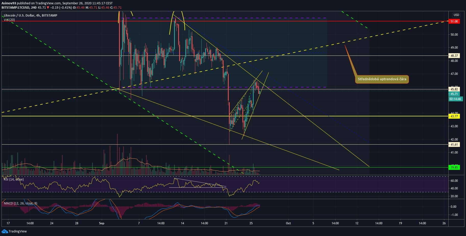 Na Litecoinu je ta situace standardně o něco horší. Zde nemůže být o double bottom vůbec řeč, neboť se přesvědčivě překonalo low z počátku září a nejbližší dno tak máme na S/R levelu 41,61 USD. Níž se kurz Litecoinu už nedostal a nám se tak rýsuje taky falling wedge, ale mnohem menší, než je tomu na trhu s předcházející mincí.