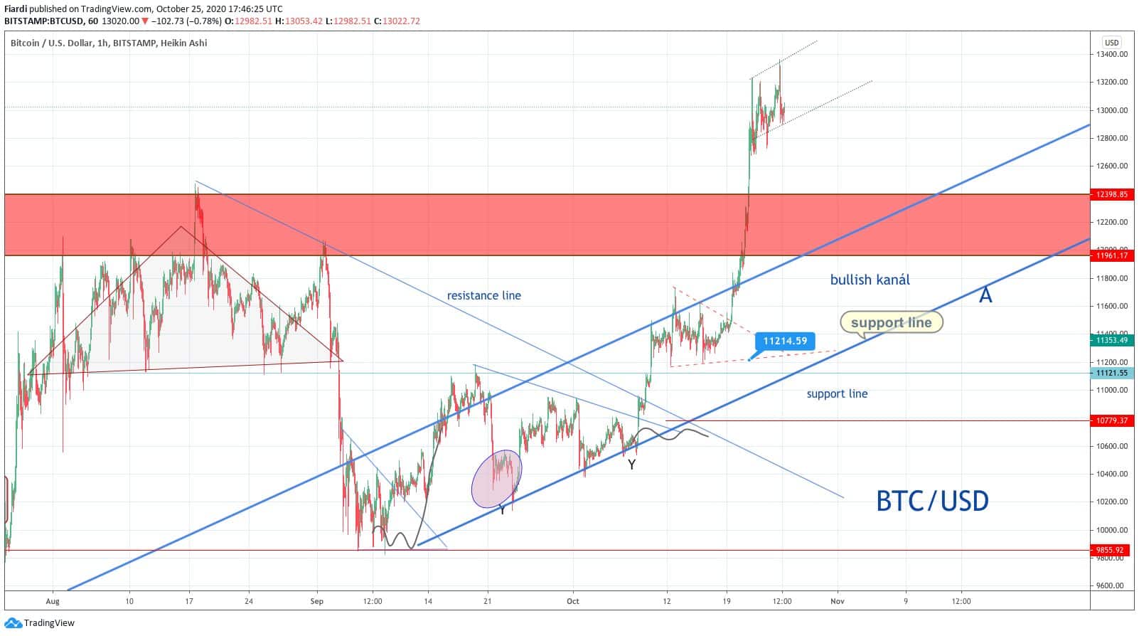 Platební gigant PayPal oznámil v tomto týdnu akceptování Bitcoinu na své platformě. Bitcoin se po této zprávě rychle dostává z hodnoty 12 200 USD až nad 13 000 USD. Na grafu vidíme výraznou svíčku po odrazu na 10 550 USD. Po propadu z 12 000 USD spadl Bitcoin až k podpoře na 9 980 USD. Propad ale rychle skončil a máme tu letošní nový rekord na 13 200 USD.
