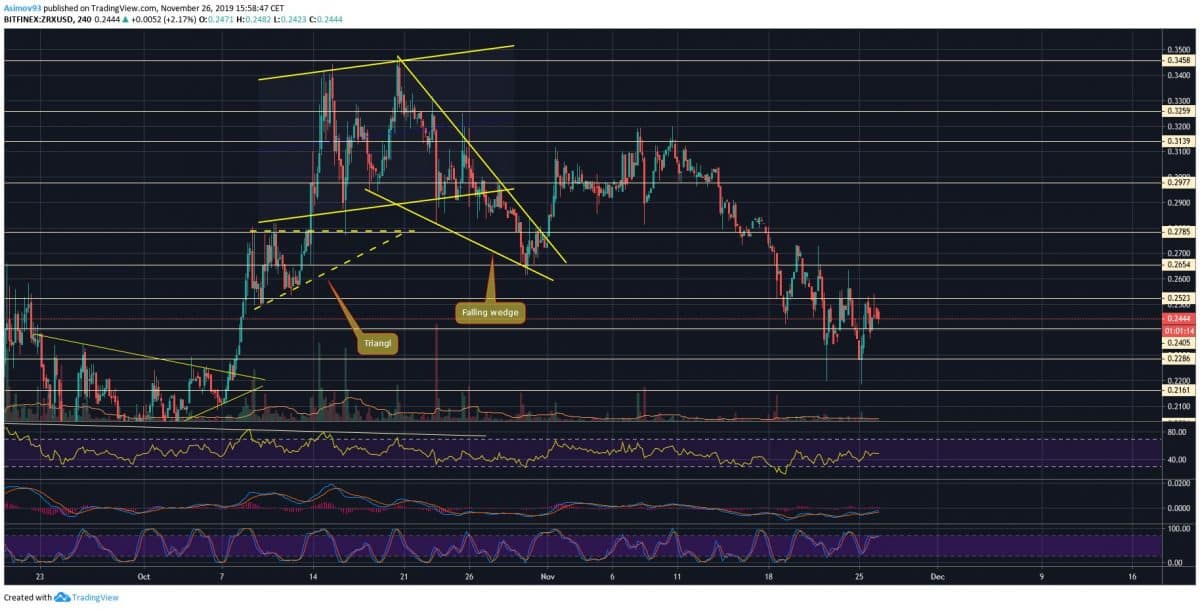 Jak už jsem řekl v úvodu, tak za posledních více jak deset dní ztratilo ZRX více jak 22 % ze své hodnoty. Teď ale právě navážu na svoji poslední analýzu, kdy se zrovna kurz tohohle coinu držel nad S/R hladinou 0.2785 USD. Skoro to chvíli vypadalo na odraz up, ale nakonec se setrvačnost trhu obrátila tím špantým směrem, což mělo za následek průraz skrze zmíněnou hladinu. Další zastávkou v této cestě měla být úroveň 0.2654 USD, ale zde teda moc k výrazné reakci nedošlo a cena začala brzy zase klesat. Rychle padla i úroveň 0.2523 USD a první výraznější odraz započal až v další úrovní na ceně 0.24 USD. Zde započal menší retracement, který ale dlouho dobu nevydržel, neboť byl zastaven již pod hranicí 0.2785 USD.