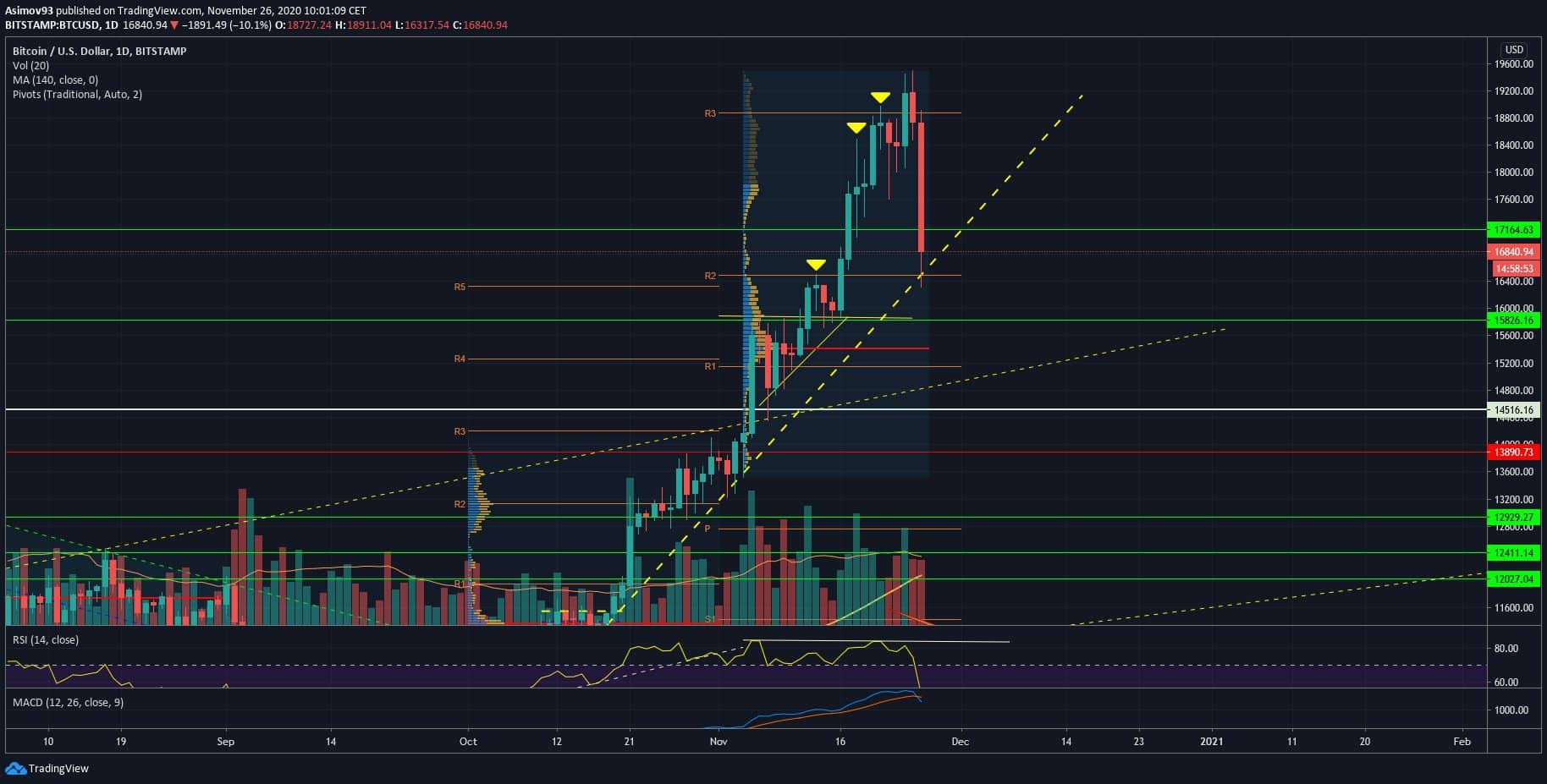 Je třeba vykrvit všechny i hodlery, aby jím povolili nervy, takže pojedeme možná až na 10 tisíc doláčů, chce si to však počkat 🙂 Ale jinak se to může nyní plácat, nejen retail, ale také instituce se musí mezi sebou vymlátit. Zajímavý, že když už začnou psát o Bitcoinu všude, tak je třeba začít prodávat! Nicméně uvidíme, na pořádnou korekci jsem čekal, přišla dost pozdě, mezitím se cena ukrutně vyhajpovala, o to větší bude možná pád. A v lednu zase pojedeme nahoru.
