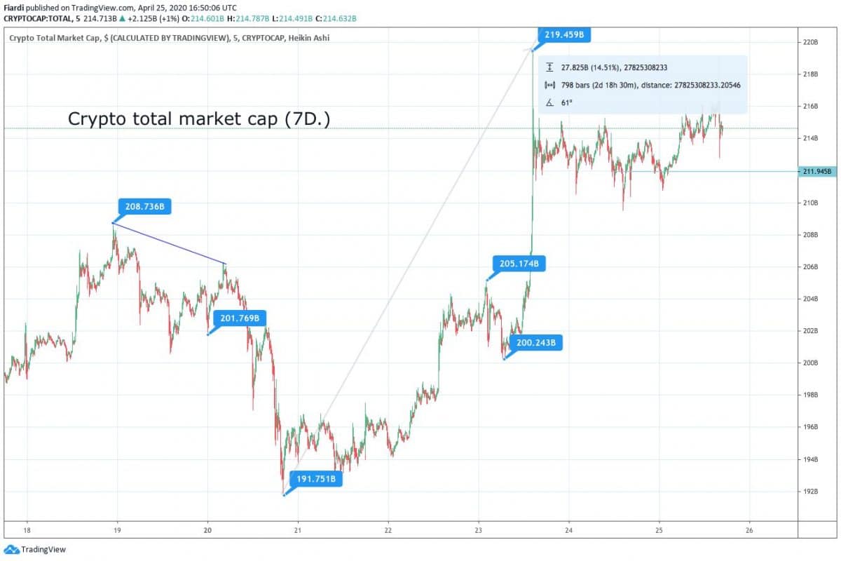 V tomto týdnu jsme se dostali na hodnoty 218,6 mld. USD marketcapu, což je od high 2020 propad o 90 mld. USD. V tomto týdnu zaznamenáváme low na hodnotě 191,75 mld. USD a high 219 mld. USD. Bitcoin vzrostl z 6 863 USD na high 7 700 USD (7D.). Momentálně se pohybujeme na 7 600 USD. Dominance Bitcoinu se ustálila na 63,9 %.