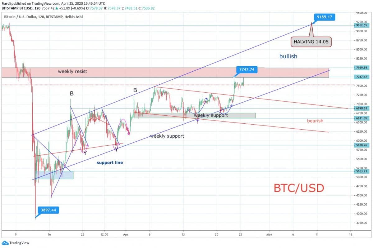 Bulls mocně zaútočili a spekuluje se, že už není čas na propady a do halvingu se bude růst. Bullish kanál, který vidíte na grafu, by mohl BTC do halvingu dovést až k cca 9 100 USD.