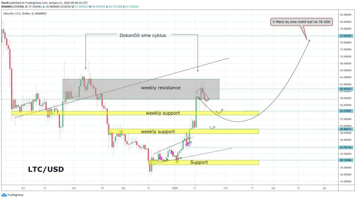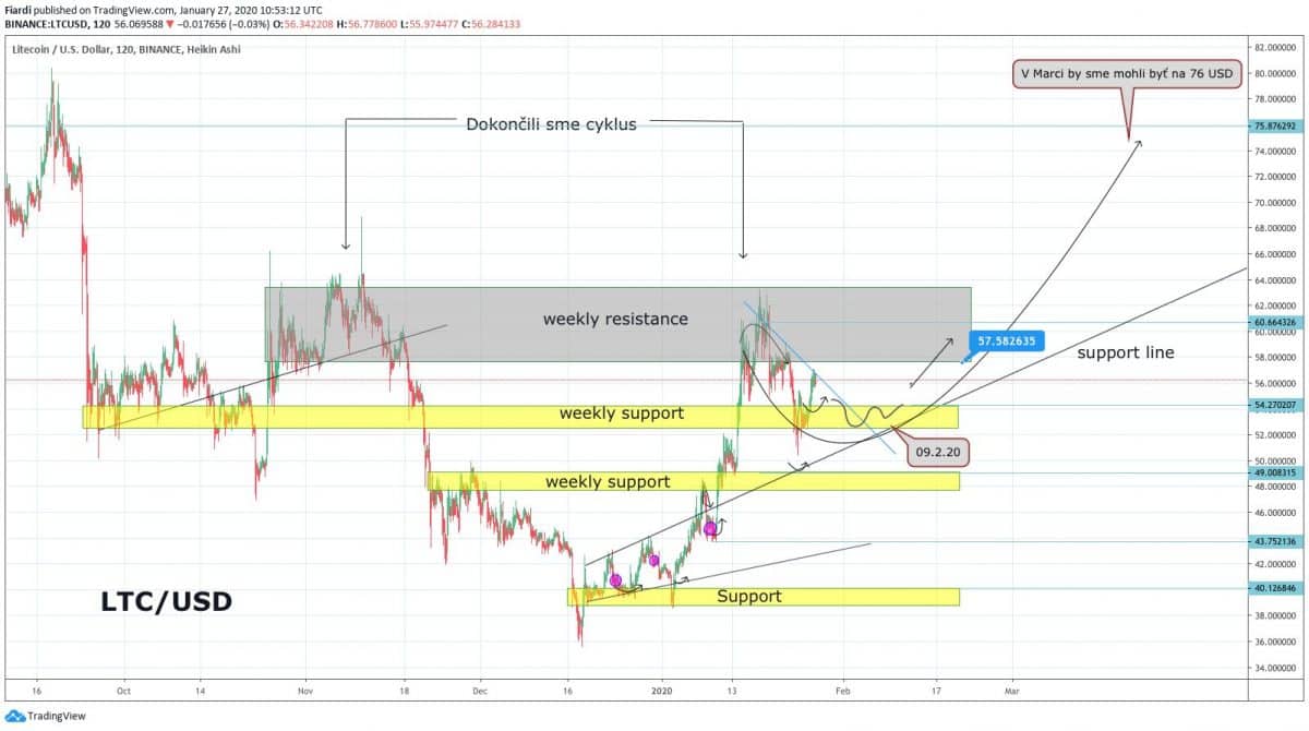 Nejbližší podpora nám stále zůstává na 50 USD i když si nejsem jistý, jestli to budeme testovat i po 2x. V rámci konsolidace máme čas do začátku února (nejpozději), kde následně vidíme agresivní support line, která by měla poslat LTC nahoru, jak jsme to už měli zaznačené 21. 01.