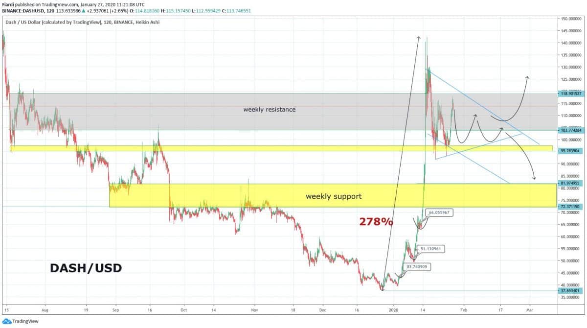 Odpor vidíme na současných 118 USD, i když celé pásmo od 103 k 118 USD je kritické. Pokud bude moje teórie o trianglu pravdivá, postupně se odpor bude zmenšovat. Na konci trianglu může jít DASH nahoru, ale musí jít i Bitcoin, po této shodě se můžeme dostat až k nejbližšímu odporu na 163 USD, kde se DASH pohyboval na topu v roce 2019. Knotem se DASH dostal až na 211 USD (2019).