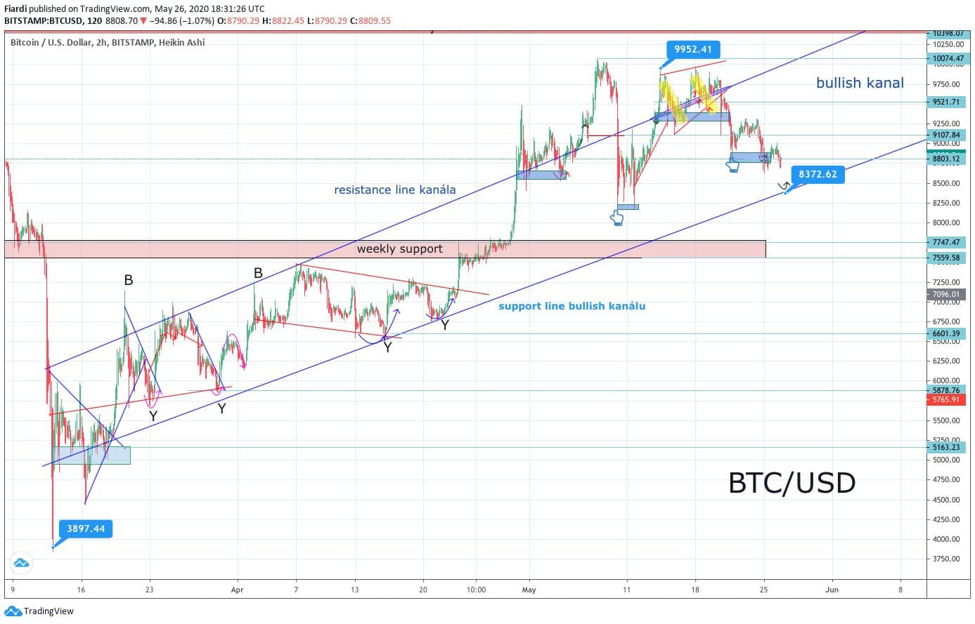 Dnes se podíváme na Bitcoin, jak vypadal za včerejšek. Low včerejšího dne byl na 8 690 USD. High jsme zaznamenali na 9 012 USD. Mnozí možná nepochopili, o čem že je přehled trhu. Vždy vybíráme top růst a top propady ze 100 kapitalizace a k tomu zhodnocení na Bitcoinu. Pokud se pár dní neděje na trhu nic, popřípadě je to pohyb o 300-400 USD, podpora jakož i odpor vždy zůstávají stejné, nemůžete z grafu vymazat to, co tam je jen proto, protože jsme pár dní stáli na místě a šli do strany.