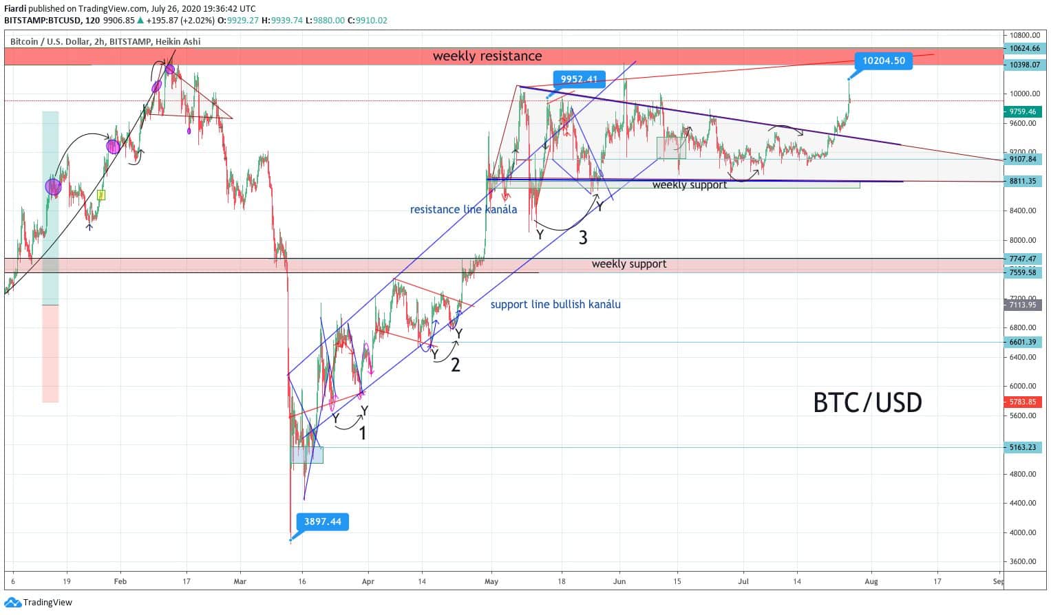 Bitcoin se v neděli vskutku překonal. Investoři začali masivní růst nad 10 000 USD. Nakonec zakotvil na 10 200 USD, odkud propadl k současné hodnotě (v době psaní přehledu) 9 891 USD. Těžko říct proč poslední 2 dny investoři přidali téměř 500 USD na jedné minci. Mnohé to překvapilo, protože jsme se delší dobu pohybovali v bearish trianglu.