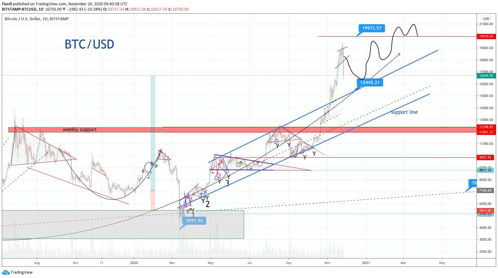 Hmmm, máme stejné myšlení teď po prvni korekci take stojím s nákupy na 12,2k a čekam na 9,2k ale i odvážně na 7,2k pro třetí korekci ( btc kotace k nákupu i jinych mých oblibenych coinu. ) spousta analýz to takto cíluje .