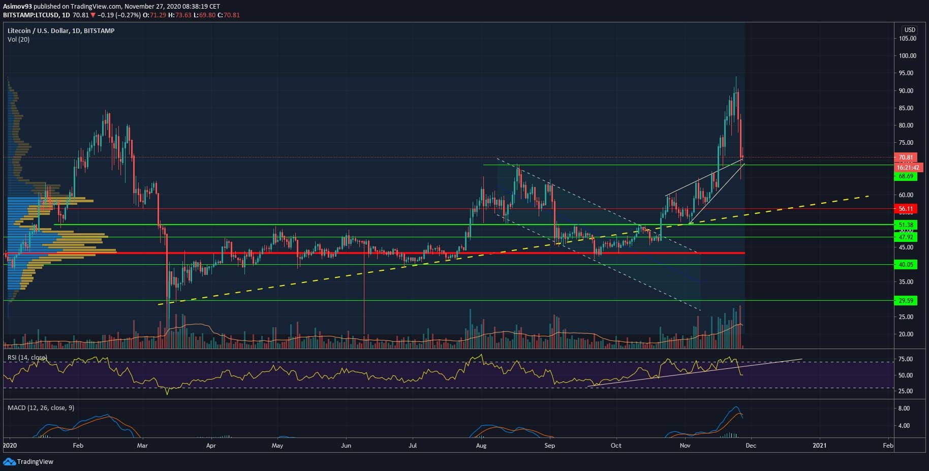Dneska se ale Bitcoinem zabývat nebudeme, protože cílem zkoumání je nyní trh s Litecoinem (LTC) a Ethereem (ETH). Na tyto trhy jsme měli poslední analýzu asi před týdnem a za tu dobu se toho odehrálo požehnaně. Korekce začala a altcoiny to samozřejmě vypláchlo – jsme zvyklí na to, že když se Bitcoin zatřese, tak to alty schytají dvojnásob.