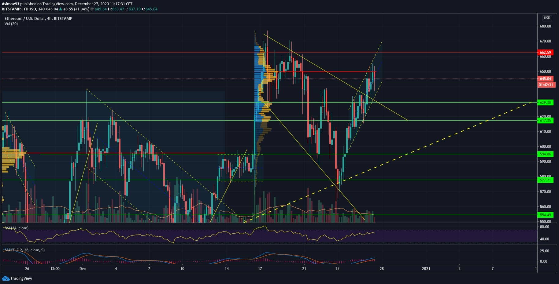 Kurz ve jmenovaném patternu konsolidoval asi deset dní, takže by Ethereum nyní mohlo mít možnost alespoň střídmějšího růstu ceny. Musí však vydržet S/R hranice 629 USD, jinak kurz asi padne až k 594,86 USD, kde je druhý bod kontroly na Volume profile. Poptávka by zde měla být dostatečně silná na to, aby byl případný pokles zastaven.