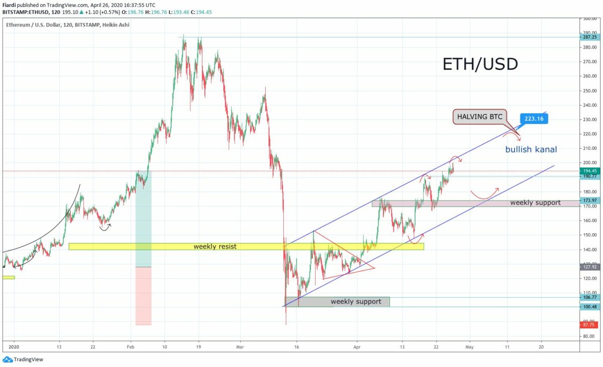 Ethereum se v době psaní článku pohybuje na hodnotě 195 USD. Jak vidíme na grafu, tak podobně jako na Bitcoinu tvoříme bullish kanál. Ethereum se drží v neděli blízko resistance line kanálu a jeho max. hodnoty momentálně ukazují na 202 USD. Můžeme čekat, že v tomto bodě to budou chtít bears poslat dolů. Nejen že zde máme resistanci line bullish kanálu, ale také to je psychologických 200 USD. To by ale nic nemělo změnit na tom, že Ethereum by mělo být do Bitcoin halvingu bullish a růst.