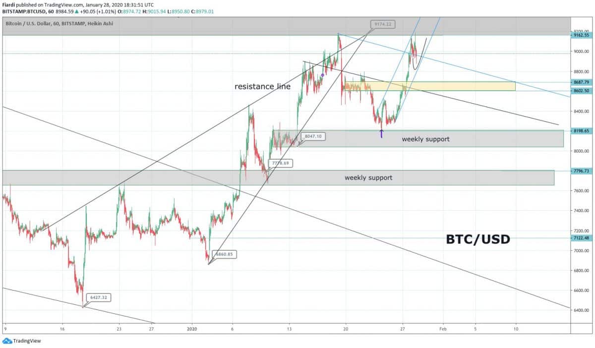 Mnohé jistě zaujme prolomený pattern rising triangle, který BTC dovedl k 8 200 USD. Při pohledu na graf jsme viděli předchozí cyklus, který se zakončil na 8 200 USD. 24.01.20 jsme začali druhý stejně vypadající cyklus, který se zakončuje na 9 000 USD. Dva velmi podobné cykly. Nejbližší support / podporu vidíme momentálně na 8 667 – 8 602 USD. Pokud bude tento support prolomen, můžeme propadnout znovu na 8 200 USD.