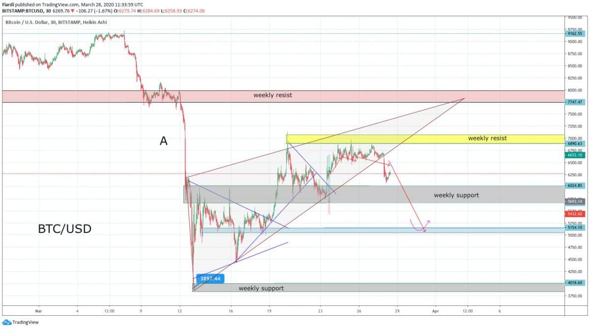 Situace se ale může v příštím týdnu změnit, protože jsme již v tomto týdnu psali o tom, že to je jen krátkodobá náplast. Včera večer jsme se mohli ve zprávách dozvědět, že US má již více než 100 000 nakažených. Novým epicentrem světa se tak stává pomalu ale jistě US. Je předpoklad, že tyto zprávy negativně zapůsobí na světové trhy v příštím týdnu. Bitcoin se obchoduje non-stop a investoři již začali s prodejem, vidíme pokles o 600 USD během necelých 24 hodin. Pokud se to stane a potvrdí, v příštím týdnu můžeme počítat s 6 000 USD podporou na Bitcoinu. Pokud bude prolomena, podle grafu vidíme 5 500 USD a následně 5 100 USD.