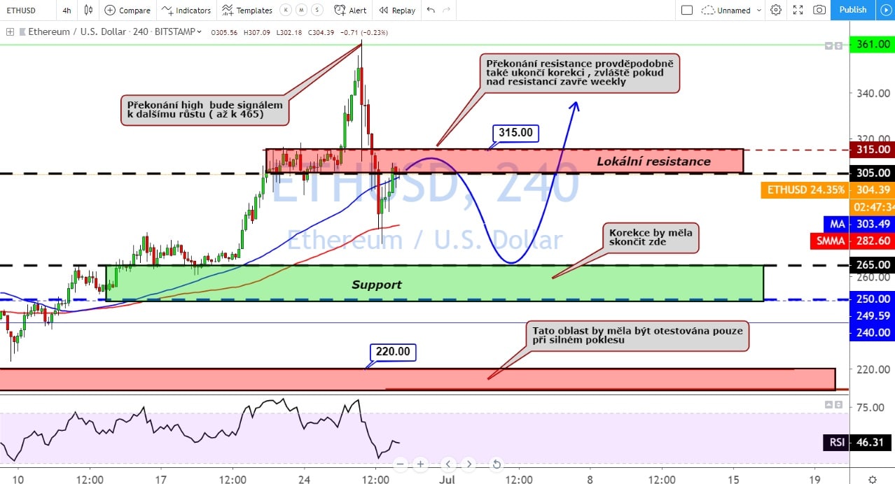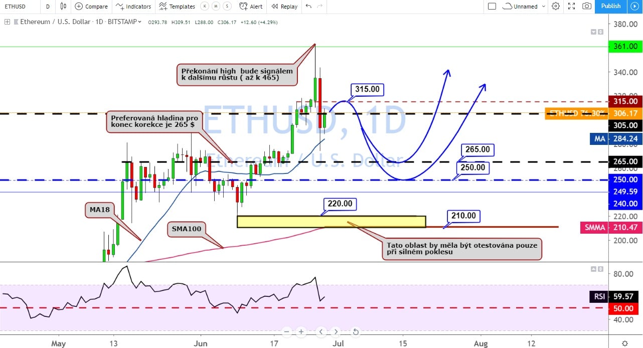 Ethereum při poklesu Bitcoinu ztratil 25% své hodnoty, ale postupně se snaží tuto ztrátu smazat. Pokud se cena ETH vrátí do konce týdne nad úroveň 318 $, tak bude trh pravděpodobně pokračovat UP. Jestliže však cena zůstane v oblasti okolo 300 $, tak se může stát, že před dalším růstem oslabí cena k úrovni 265 $.