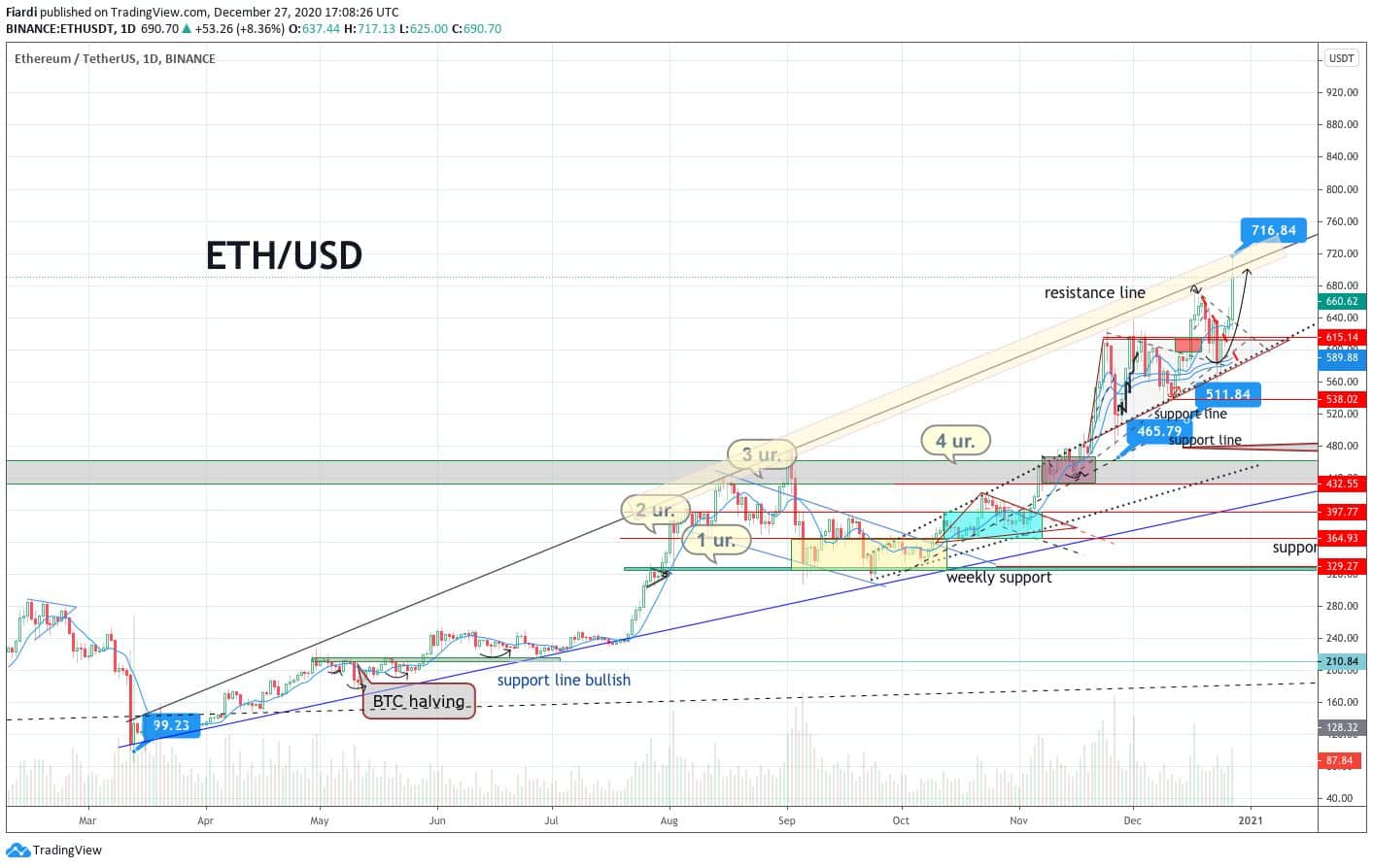 Neskutečný růst během roku 2020. V rámci něj sledujeme již 10 měsíců bullish otevřeného kanálu, který nás v neděli dovezl k 700 USD. Na grafu vidíme odpor na 700 USD, knotem jsme již byli na 716 USD, ale na 4 hodinovém grafu vidíme snahu medvědů ubránit 700 USD a poslat to níže. Podpora je na 616 USD a 580 USD.
