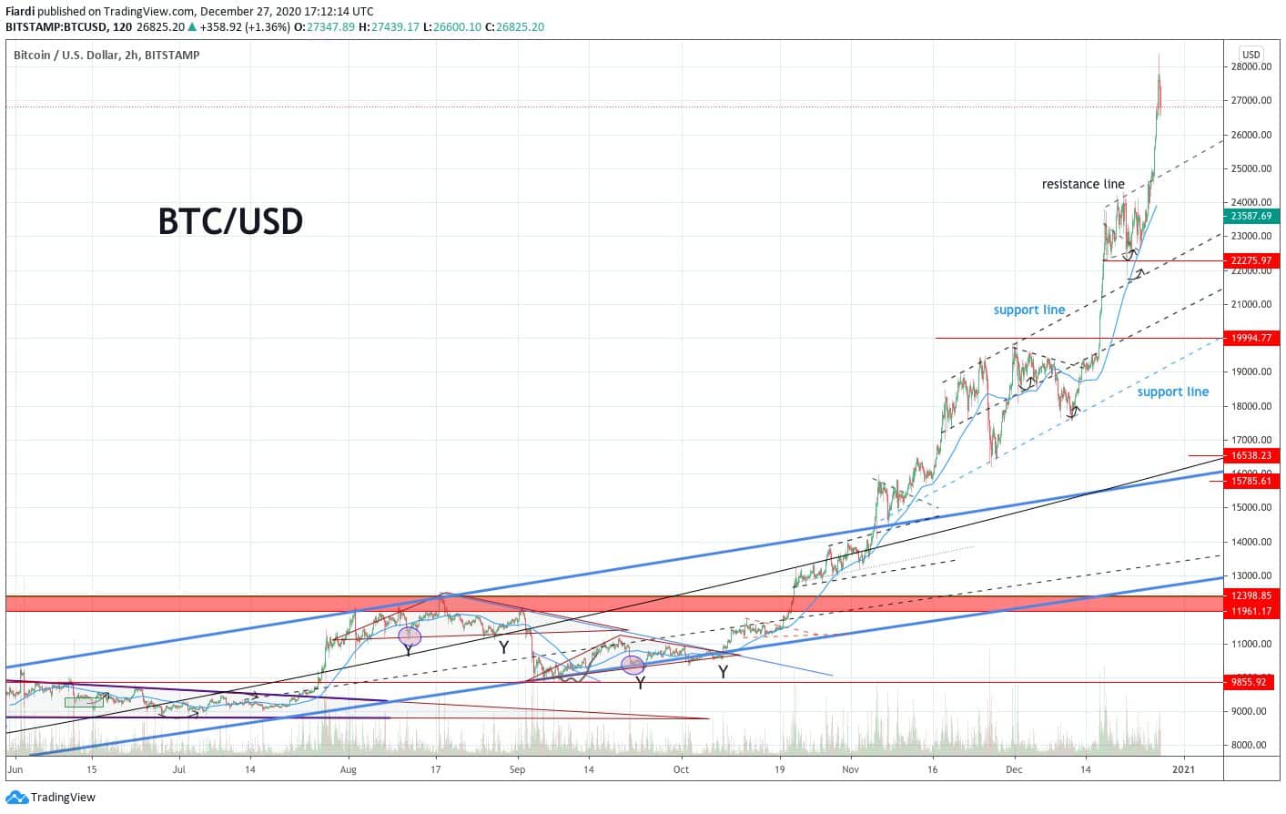 Bitcoin za poslední týdny vytváří téměř každý den nové ATH. Výjimkou není ani neděle. Dosáhli jsme hodnoty téměř 28 300 USD. Momentální podpora je na 24 500 USD. Odpor začíná na 29 000 USD a pokračuje k 30 000 USD. Těžko soudit, zda se investoři pokusí dosáhnout 30 000 USD již v roce 2020. Pár dní jim ještě zbývá. Mnoho investorů přemýšlí nad rokem 2021 a kam až může Bitcoin vyrůst. 50 000 USD? 100 000 USD? 250 000 USD? I když je 50 000 USD dost reálných, predikovat to zatím nemůžeme, bude to záležet na chování retailu a velryb a uvidíme, kam to až posunou. Rozhodně ze zkušenosti víme, že bez stop lossu by to mohlo padnout nepříjemně dole. Doporučujeme jej tedy využívat.