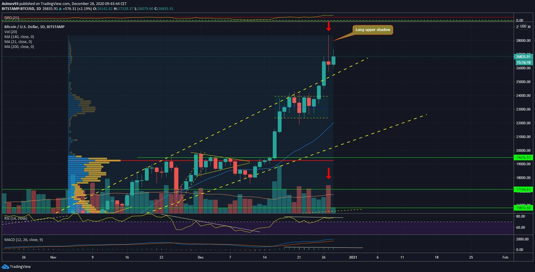 Co se týká indikátorů MACD a RSI, na obou je medvědí divergence. Takových divergencí bylo za posledních pár měsíců nespočet, ale Bitcoin nikdy nějak valně nereagoval. Což nyní může být jiné, protože prodejci reagující na divergence mohou long upper shadow brát jako potvrzení. Jsou různé typy prodejců reagujíc na všemožné signály. Jakmile se jedna skupina přidá k další skupině, domino efekt může odstartovat.