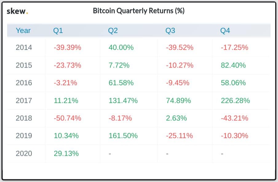 Bitcoin v roce 2020 dosud dosáhl zisk 30%. V žádných dalších čtvrtletích za posledních šest let nedosáhly trhy tak silné výsledky během Q1. V letech 2011 a 2013 byly výnosy Q1 nejsilnější, podle cenového indexu Bitinfocharts , na 165% a 570%. Zajímavý je také Q2 kde z posledních 6 let jsme byli 5 krát ve výrazném růstu. Halving Bitcoinu je naplánován na květen 2020 a mnozí očekávají raketový růst Bitcoinu. Trh je velmi pozitivní a na ceně se to výrazně odráží.