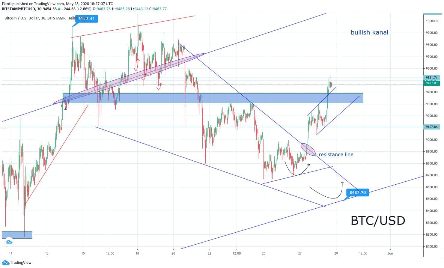 Na Bitcoinu se momentálně pohybujeme na hodnotě 9 450 USD. Low jsme zaznamenali na 9 105 USD a high na 9 535 USD. Zde je několik faktů, z nichž vycházejí investoři a proč mají důvod na Long. V první řadě jsme prolomili klesající kanál, kde jsme v minulém přehledu trhu psali o této možnosti. Pokud se prolomí resistance line trianglu, investoři půjdou do Longu. Nasledoval růst k 9 100 USD. Dnes ráno se vytvořil krátký bullish kanál a investoři se utvrdili v pokračování Longu. Stop loss tedy posouváme z 8 900 USD na 9 100 USD.