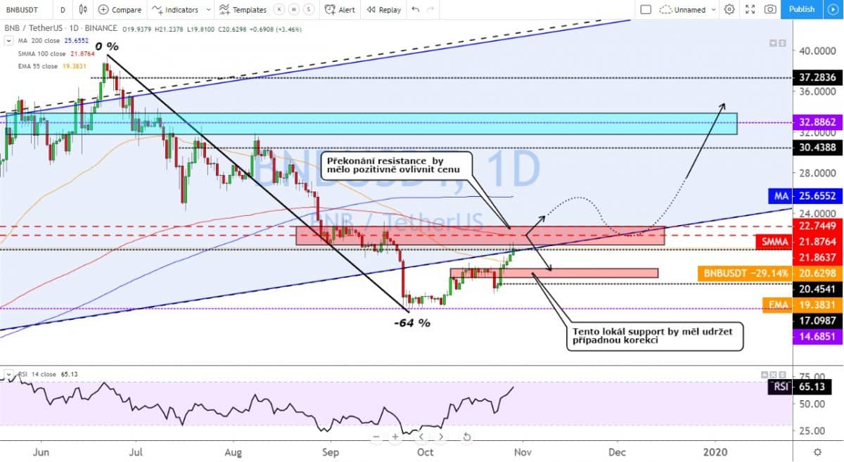 Z dlouhodobého pohledu se cena BNB pohybuje uvnitř vzestupného trendového kanálu, ale při posledním propadu z ceny 22,20 USD se dostala mimo tento TR kanál. Nicméně současný růst vrací cenu zpět do tohoto trendového kanálu a právě překonání rezistence by mohlo být takovou pojistkou, že cena zůstane uvnitř trendového kanálu.
