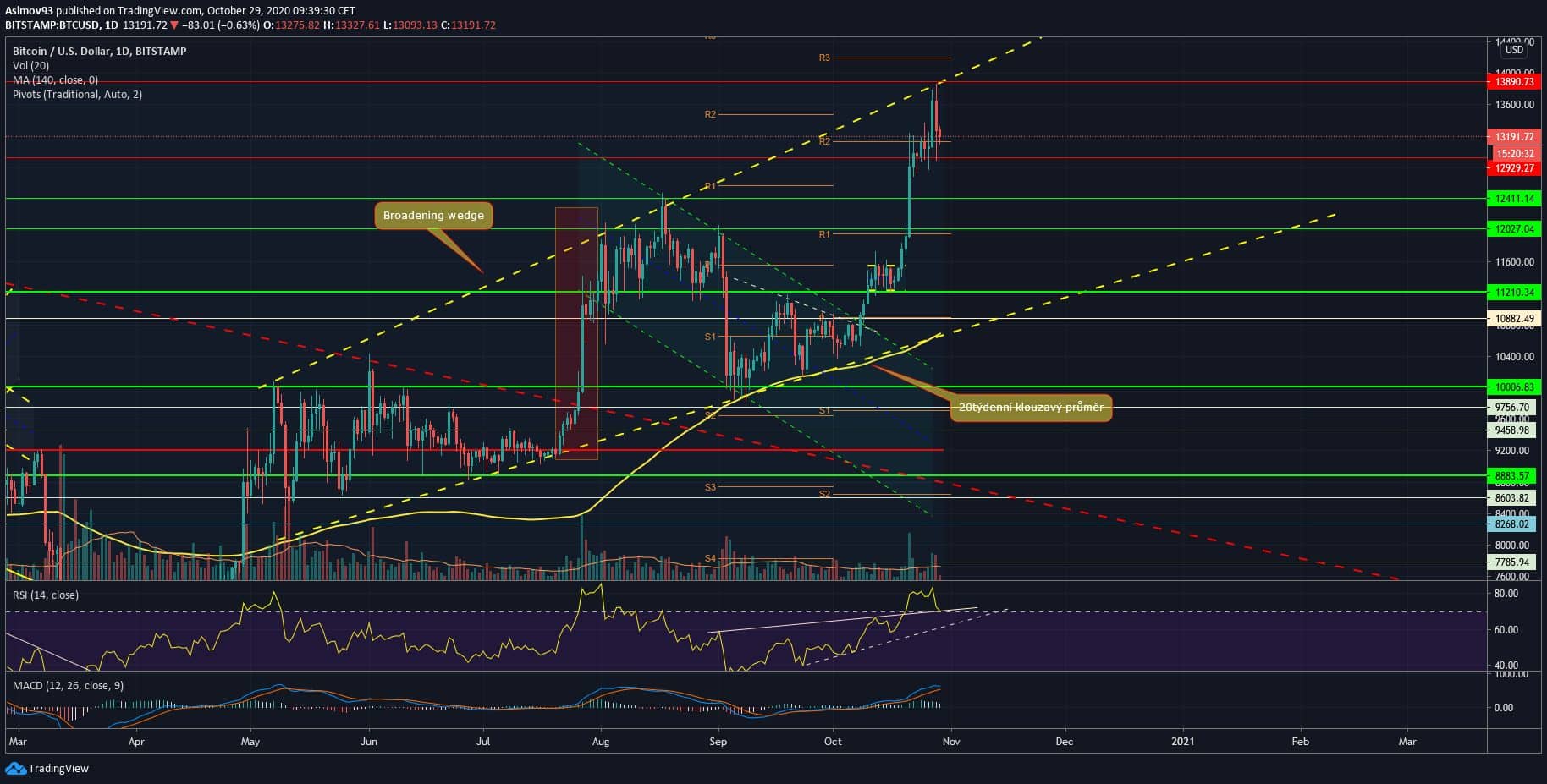 Leč mnohokrát jsem upozornil na to, že je to bearish struktura, i když se to na první pohled nemusí zdát. V kontextu patternu je nyní opodstatnitelný dump po jeho spodní stěnu – takže cca 11 200 USD – 11 500 USD. Záleží na dynamice poklesu (pokud k tomu dojde). Každopádně těch cca 12 929 USD funguje prozatím spolehlivě jako support. Určitě tomu pomáhá i měsíční pivot R2.