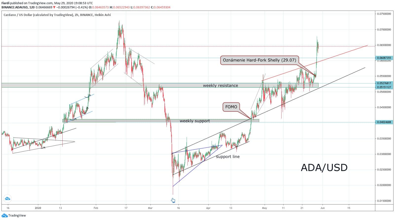 Cena ADA po oznámení Shelly hned explodovala! Okamžitě po oznámení začalo Cardano růst v jedné velké 4 hodinové svíčce a růst představoval 23%. Cardano po tomto růstu nepadlo hned dolů, a to je pozitivní. Investoři určitě neřekli poslední slovo, do léta může předvést růst k 0,10 USD.