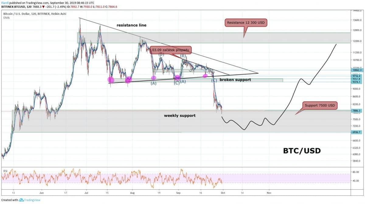 Situace na BTC / USD je lehká. V mých posledních 4 TA, které jsem psal na BTC, jsem varoval před propadem na 7 500 USD. Poslední TA si můžete přečíst zde: 27.09.19 Technická analýza BTC Bullish scenář – a fake news o Bakkt, Nasdaq, Dow Jones.
