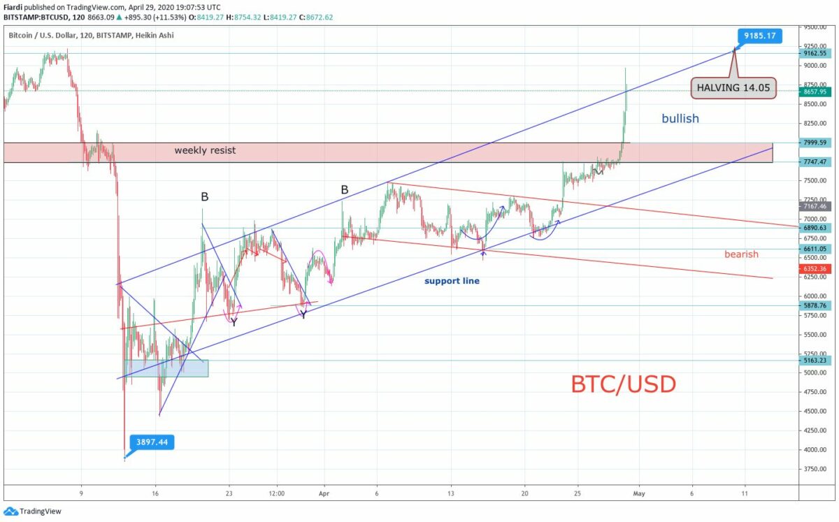 Včera jsme na Bitcoinu mohli vidět 12% pumpu. Tato pumpa přichází v době, kdy už potřetí za tři týdny vidíme pumpu o velikosti více než 10%. Každý týden nějaká velryba nakoupila Bitcoin s takovou velikostí, že to pumplo o 10% výš a ani včerejšek nebyl výjimkou. Bitcoin se na moment dostává až na 8 970. Tento růst je podpořen i růstem světového trhu a Bitcoin pomalu ale jistě finišuje k našemu cíli 9 100 USD, který jsme si vytýčili na 5 000 USD. V té době tato predikce do halvingu vyzněla fakt neuvěřitelně i po tom, co jsme padli z tohoto ročního high 10 500 USD. No jak se ukazuje, začíná to být velmi reálné. Halving by měl být 12.05.20 a nezadržitelně se blíží. Mnozí analytici hovoří o 10 500 USD za Bitcoin, tedy návrat na high letošního roku. Je tu ale i skupina analytiků, kteří poukazují na každodenní průměrný růst Bitcoinu a hlavně na důležitou věc. Počet vyhledávání na Google se slovem halving či Bitcoin neustále roste a dostali jsme se na letošní high.