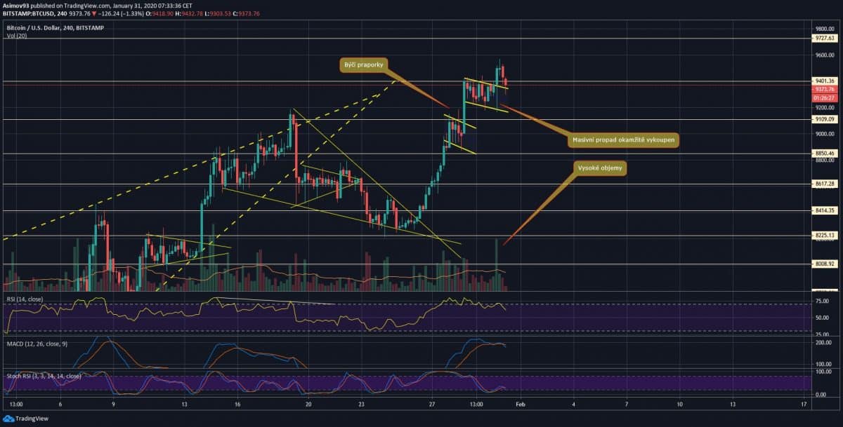 Tradičně naváži na svůj poslední příspěvek, kdy jsme tedy měli po tom breakoutu z bullish wedge. Jak jistě víte, tak kurz stabilně dost posiloval. Výkyvy tu samozřejmě byly, ale na vyšších časových rámcích moc zpozorovatelné nejsou. První „větší“ zaváhání tu máme až u rezistence 9 109 USD. Nicméně, s tím si trh velmi snadno poradil tím, že kurz zkonsolidoval do podoby býčí vlajky. Ono těch býčích vlajek bylo v rozmezí 8 400 – 9 100 USD více, ale jdou identifikovat pouze na menších časových rámcích. No, u úrovně 9 109 USD je znát zaváhání, ale propad je okamžitě vykoupen a po konsolidaci do podoby bull flagu následuje průraz skrze rezistenci.