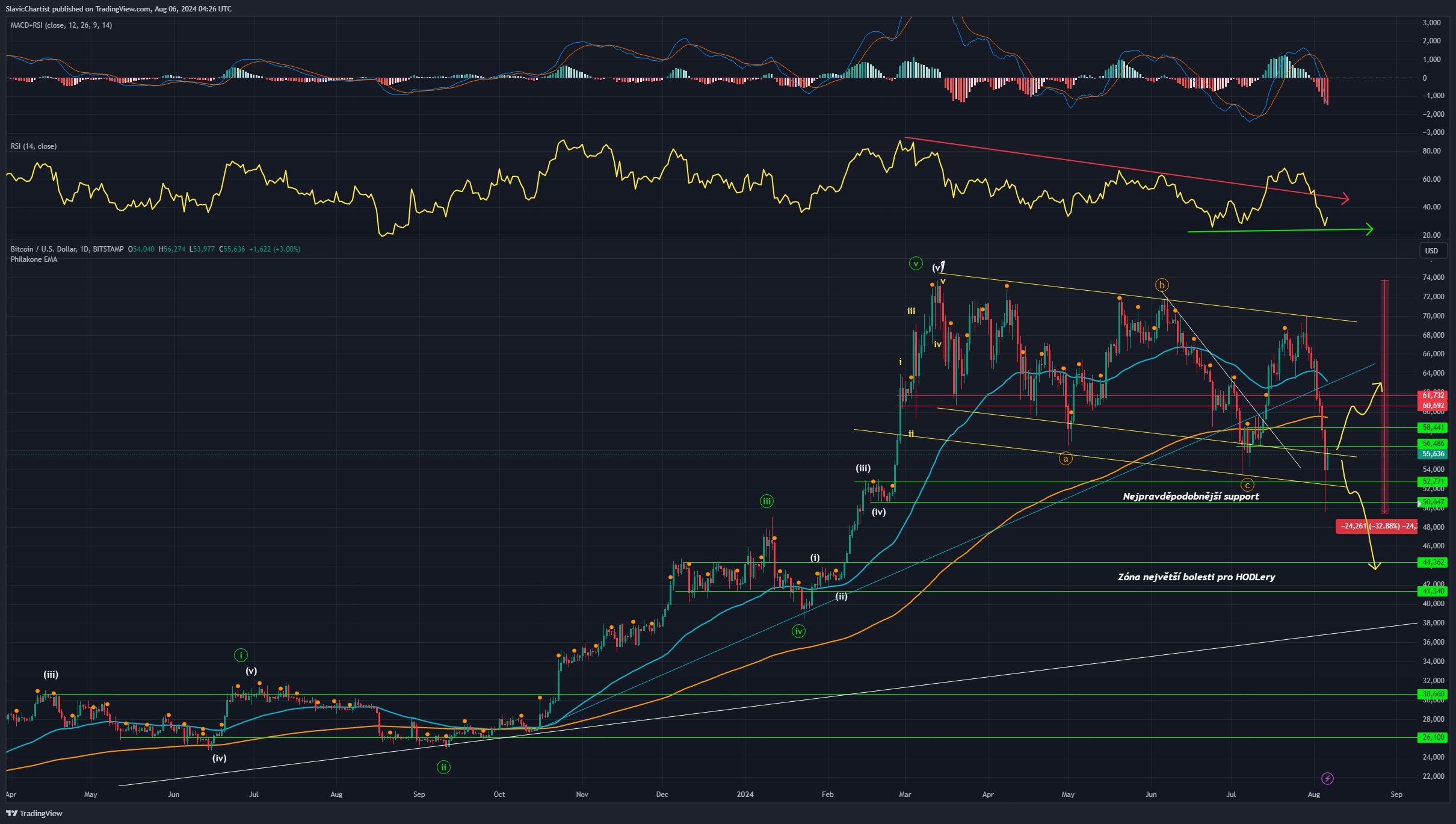 V případě pokračování propadu akciových indexů je možný až pokles po další supportní zónu kolem 45 000-41 000 USD. A přesně na tuto zónu čekám. Tam bych rád nabral dominantní část své dlouhé pozice.
